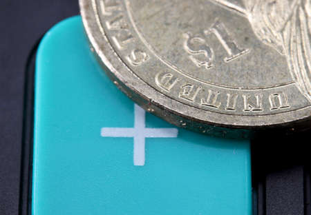 US dollars, coins on calculator on gray background