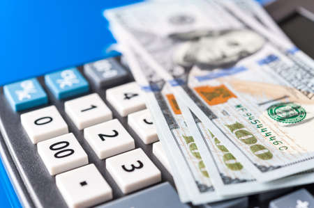 Business and financial background with dollars and calculator. Bookkeeping background.