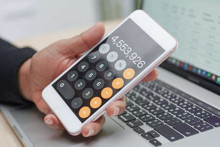 Businessman is calculating balance, expected profit or expenses with smartphone. business plan and self accounting concept