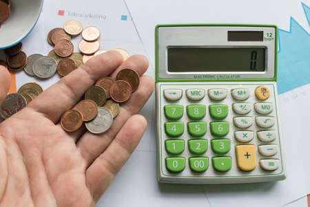Calculator, banknotes and coins on the table. Business concept