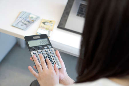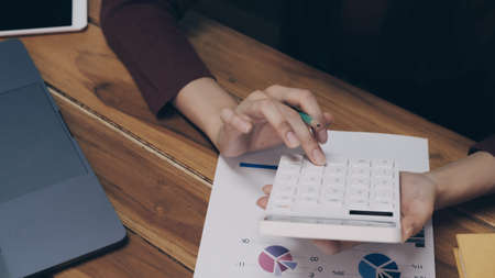 Close up Business woman using calculator for do math finance on wooden desk in office. tax, accounting, statistics and analytic research concept. top view.
