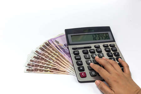 Hand woman using calculator with money on white background