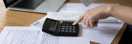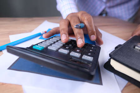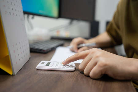 Close-up view A businessman using a calculator to calculate numbers on a company's financial documents, she is analyzing historical financial data to plan how to grow the company. Financial concept.