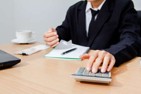 businessman using calculator and holding pen on tax paper in office.Accounting
