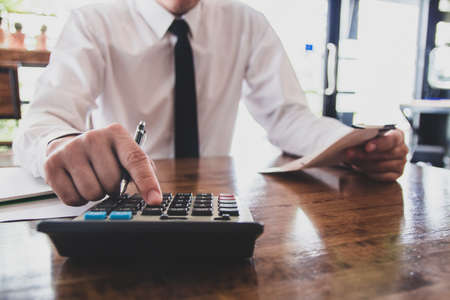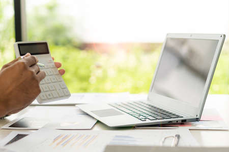 Business accounting concepts. Businessman or accountant using calculator to calculate business report, financial data report, accounting document, with laptop computer at home office.