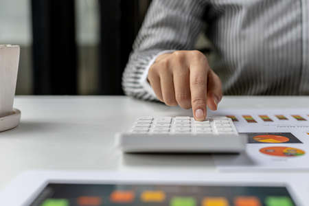 Close up Business woman hand using calculator to calculate the companys financial results and budget. Account Audit Concept