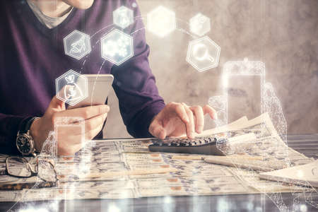 Double exposure of man's hands holding and using a digital device and tech theme hologram drawing. Technology concept.