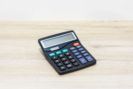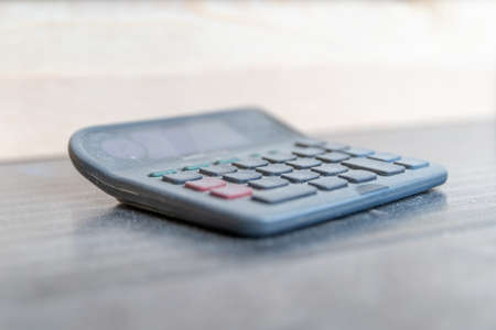 A calculator and a notebook on a wooden table with copy space. Selective focus.