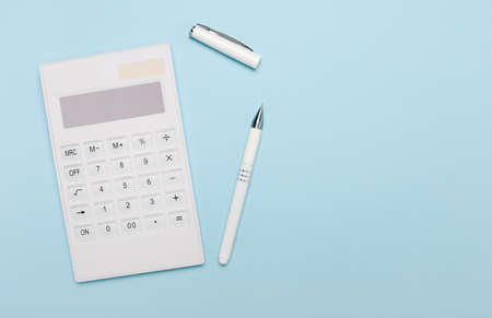 On a light blue background, a white calculator and a white pen. Copy space. Business concept