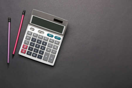 Top view of black calculator with pen and copy space. Technology and financial concept.