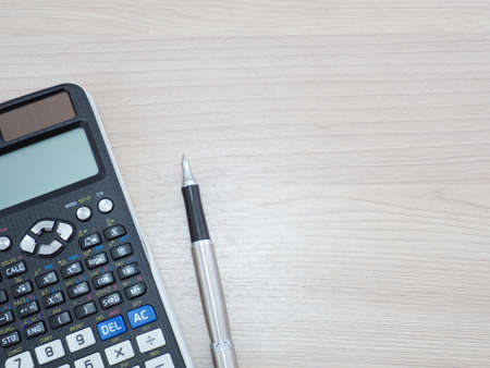 Calculator keypad on a wooden floor background. Top view. Copy space