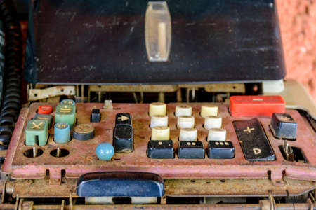Close up detailed view of historical old calculator with small iron buttons.