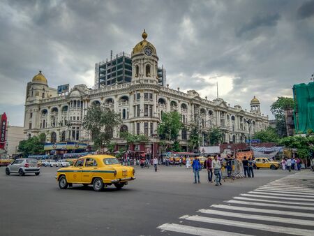 Kolkata, West Bengal / India - April 7, 2019: Cityscape, traffic of a notable city road near Esplanade with a yellow taxi at Chowringhee area, Kolkata ( Calcutta ), West Bengal, India