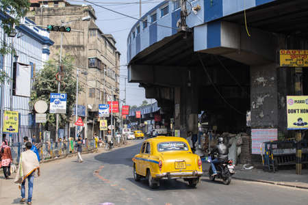 Kolkata, India - February 1, 2020: Unidentified people stands and walks on the street as a traditional yellow taxi and motorbike drives by underneath Maa Flyover on February 1, 2020 in Kolkata, India
