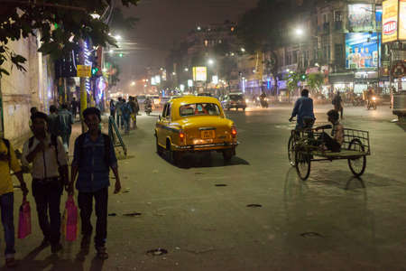KOLKATA, INDIA - 21 Oct 2016: A traditional Ambassador taxi at night October 21, 2016 in Kolkata (Calcutta), India
