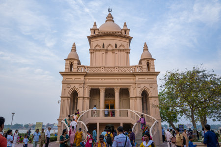 Calcutta, India - March 24, 2024: Groups of people are seen walking and standing in front of the Swami Vivekananda Temple at Belur Math, with the temples domed architecture, arched entrances, and exterior staircase visible under a partly cloudy sky.
