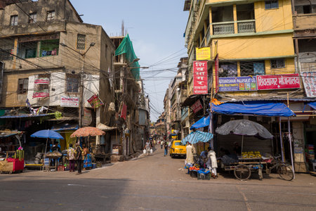 Calcutta, India - March 25, 2024: A street in the Bara Bazar neighborhood is shown with people standing near market stalls, shopfronts with signage in multiple languages, multi-story buildings, overhead electrical wires, and a yellow taxi visible in the b