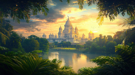 The majestic Victoria Memorial in Kolkata, surrounded by lush gardens under a dramatic sunset sky