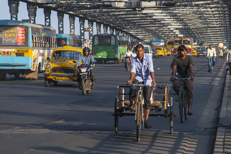 KOLKATA, INDIA - 22 Oct 2016: A bicycle rickshaw rides through tourist hotspot Sudder Street on the morning of October 22, 2016 in Kolkata (Calcutta), India