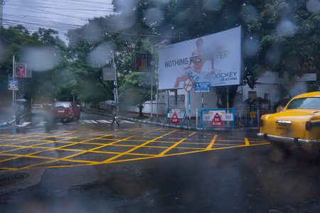 Kolkata, West Bengal, India - 25th September 2019 : Image shot through raindrops falling on wet glass, abstract blurs of zebra crossing - monsoon stock image of Kolkata (formerly Calcutta) city ,