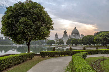 Landmark building of Calcutta aka Kolkata , Victoria Memorial Hall with Queen s Garden in the foreground, pond, white Marble, cloudy sky