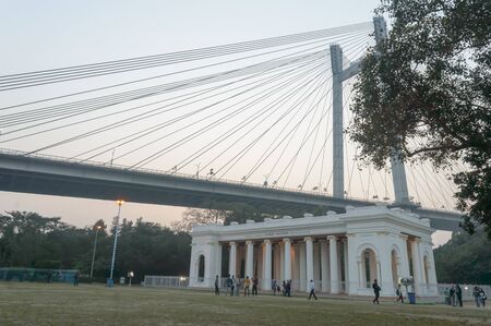 James Prinsep Ghat Memorial Monument port with Hoogly bridge overhead. Grand white marble Palladian porch British architecture. Famous place in Kolkata West Bengal India South Asia Pacific May 2020