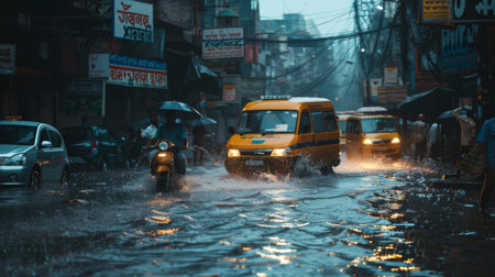 At night, cars drive down a flooded street surrounded by buildings and trees in the city. The water covers the asphalt road as vehicles travel through the urban landscape