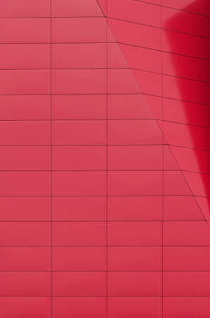 Red architectural structure with circular opening and blue sky with white clouds, abstract modern art concept