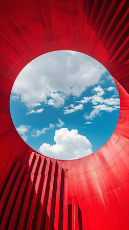 Round red structure with view of sky and clouds through circular opening, architectural abstract concept