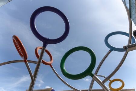 Bristol-May-2020-England-a close up view of the bright coloured metal rings art structure outside the children hospital in Bristol