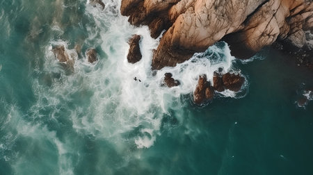 This photo captures a birds-eye view of the expansive ocean with crashing waves and rugged rocks along the coast, Surreal overhead scenery of soft sea waves dashing against rough rocks, AI Generated