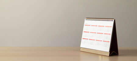 Calendar page close up on wood table with white wall background business planning appointment meeting concept