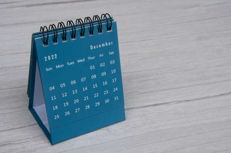 December 2022 blue color desk calendar on wooden desk. Copy space