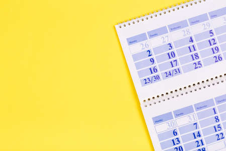 White clean calendar on solid yellow background with copy space, business meeting schedule, travel planning or project milestone and reminder concept.