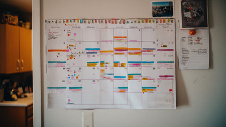 A vibrant monthly calendar filled with colorful annotations and notes, showcasing a structured approach to planning events and tasks in a cozy kitchen space.