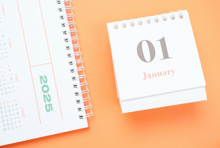 January 2026 calendars close-up on yellow and blue background, planning concept.