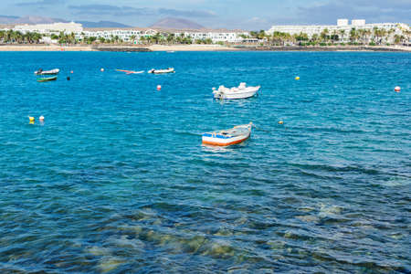 View of Playa de las Cucharas beach in Costa Teguise, Lanzarote, Spain, turquoise waters, boats, selective focus
