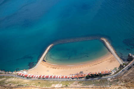 Gran Canaria, view from abve to a small town beach in Puerto de las Nieves, full of people