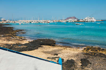 Corralejo, Furteventura, Spain - April 03, 2017: View of public beach in Corralejo with the port in the background