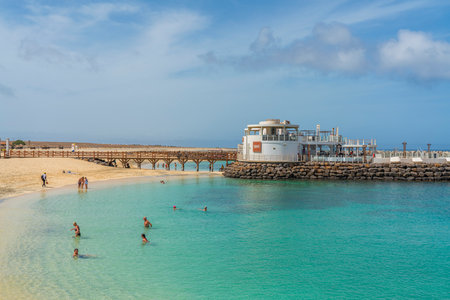 SAL ISLAND, CAPE VERDE - JUNE 22.2022: People at the sandy beach at Santa Maria beach on Sal Island - Cape Verde - Cabo Verde