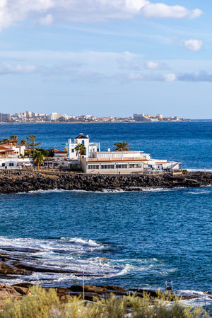 El Medano, Tenerife, Spain - Oct 1,2025 View of El Medano touristic place for surfing, kitesurfing, and windsurfing. High quality photo