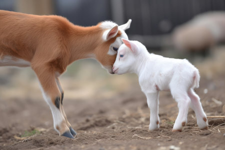 tiny goat with enormous head-, knocking over other tiny goat, created with generative ai