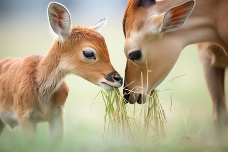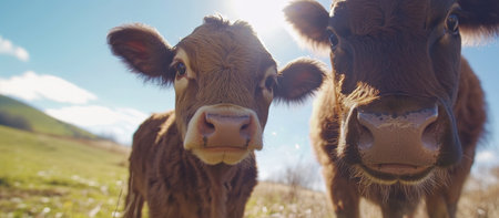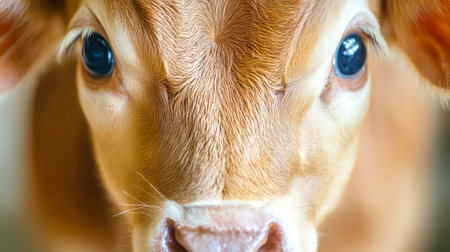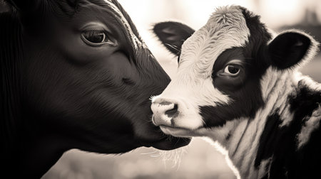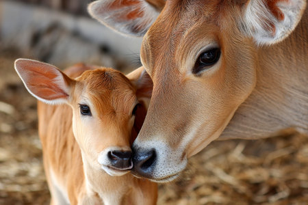 A close-up captures a young calf with soft, brown fur alongside its mother. The image showcases detailed textures and a warm, natural color palette. The composition emphasizes intimacy, likely taken in a farm or rural setting. Suitable for various projects, including editorial features and commercial advertising.