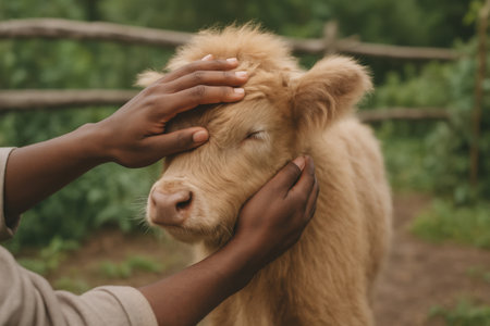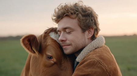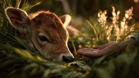 A young calf leans in, licking the farmer's hand gently in a peaceful farm environment. The warm sunlight highlights their connection and tranquility of the scene.