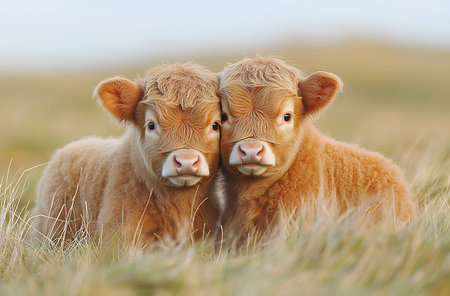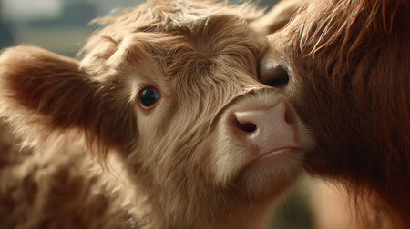 A close-up captures a Highland cow, displaying detailed textures of its fur. The soft lighting emphasizes the cow's expressive eyes and facial features. The composition shows the cow interacting with another, suggesting connection and companionship. Suitable for various projects involving agriculture, animals, or natural themes, among others.