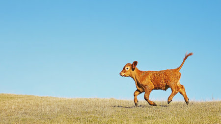 A pedigree calf playfully running through a pasture, its tail flicking, with a clear blue sky and room for copy.