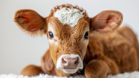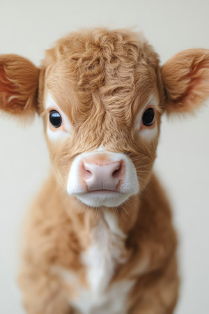 Adorable brown calf standing against a white background, soft lighting to highlight its fluffy coat