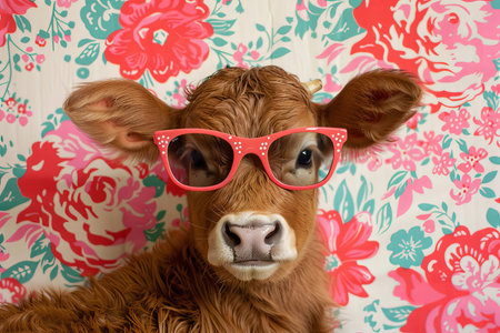 Close up of a playful calf in stylish sunglasses against a vibrant, colorful background, capturing a whimsical, fun vibe.