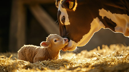 A mother cow gently licking her newborn calf in a barn, with fresh straw bedding and warm sunlight highlighting the tender moment.