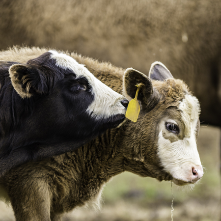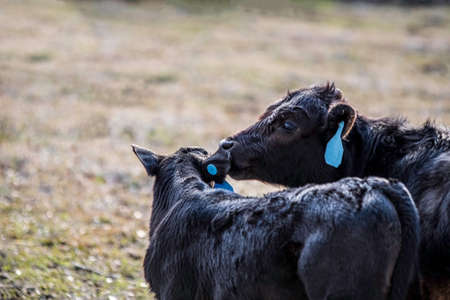 One young Angus calf seems to be whispering in the ear of another calf with defocused background and copy space to the left.